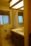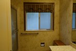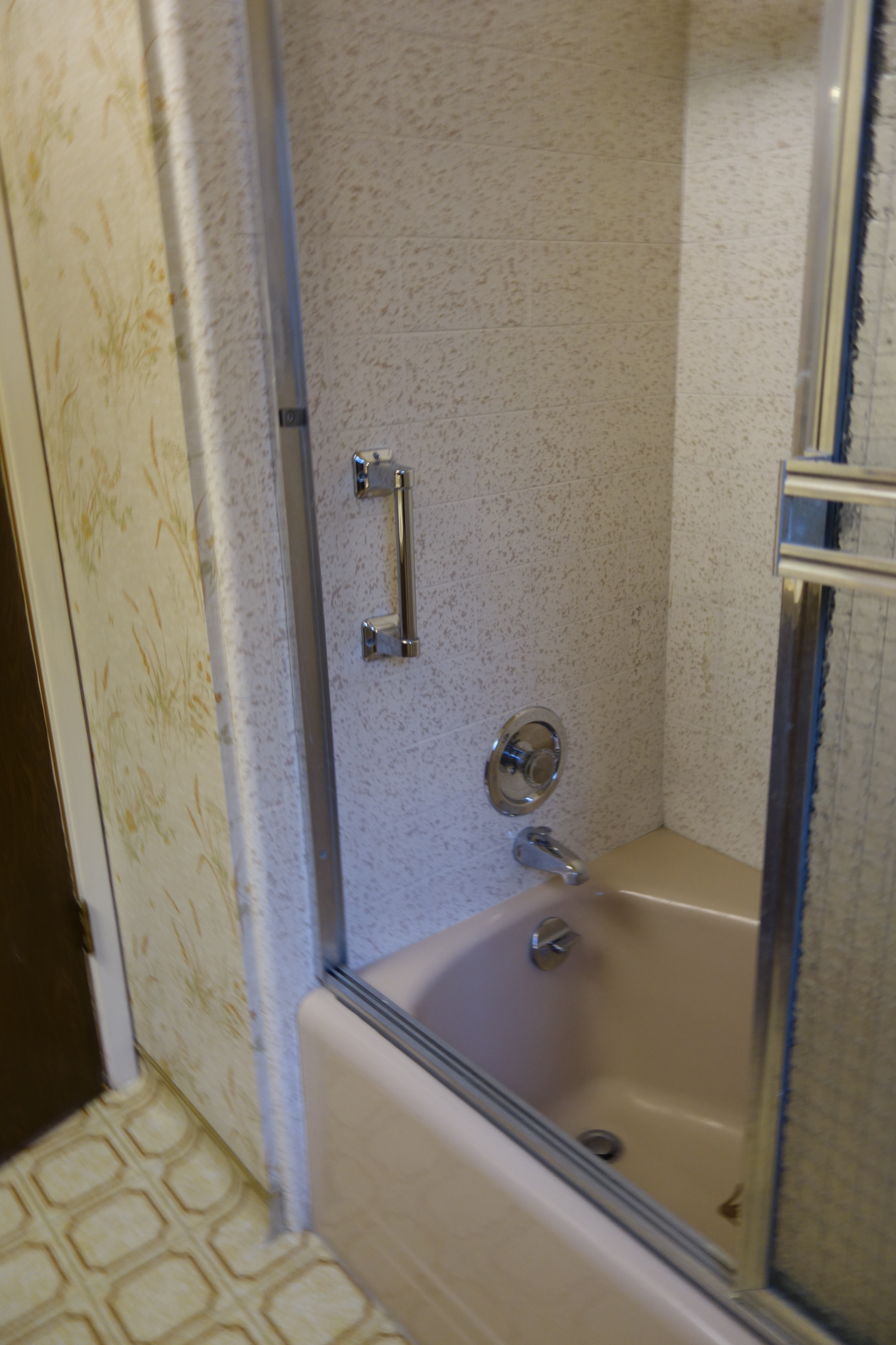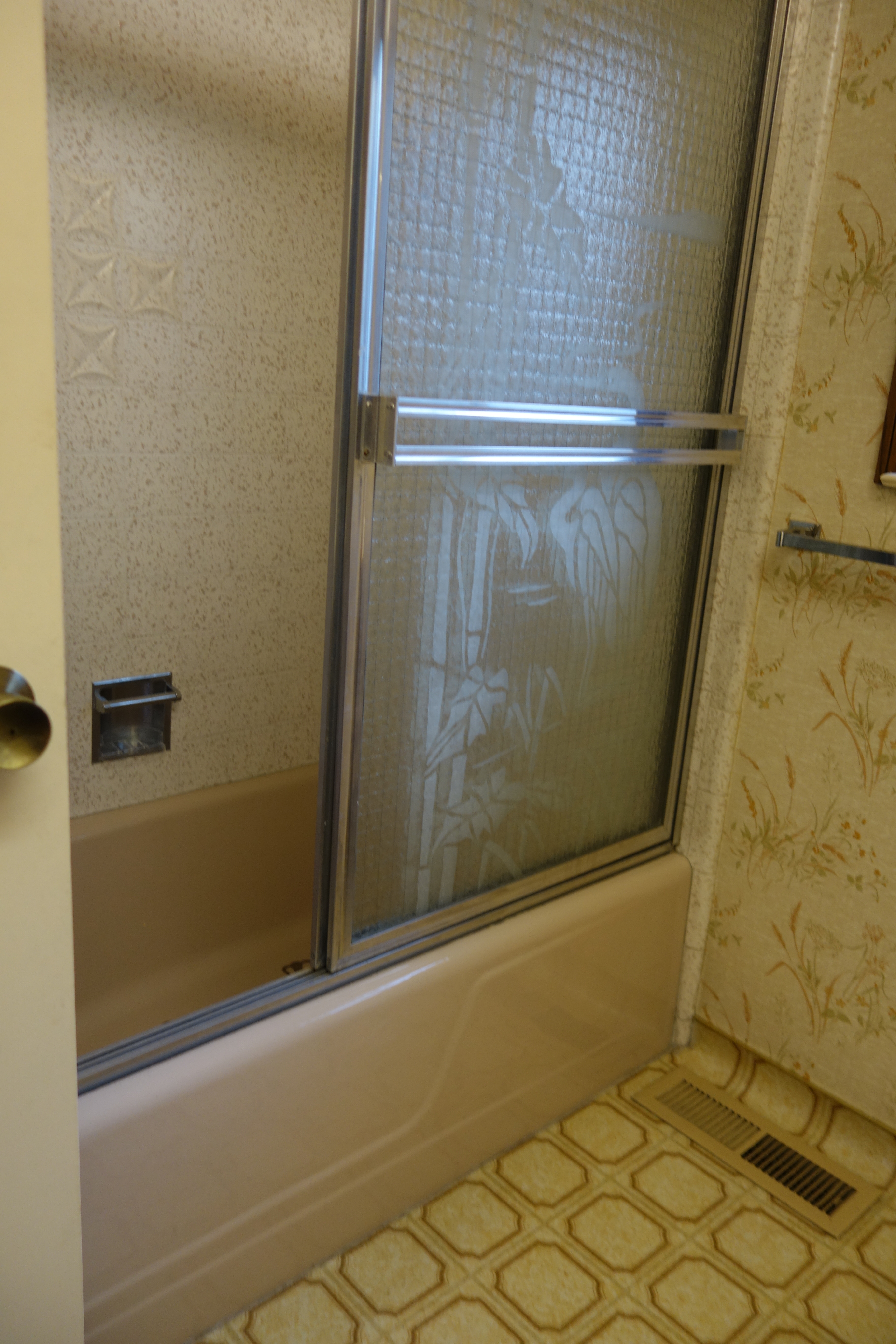 Before I show the actual renovation, let me first give you a taste of what the original bathroom looked like. Lots of warm, neutral colors with that aforementioned wallpaper and disgusting pink bathtub that I just could not fathom. And what is up with the wooden toilet cover? Needless to say, a makeover was long overdue.